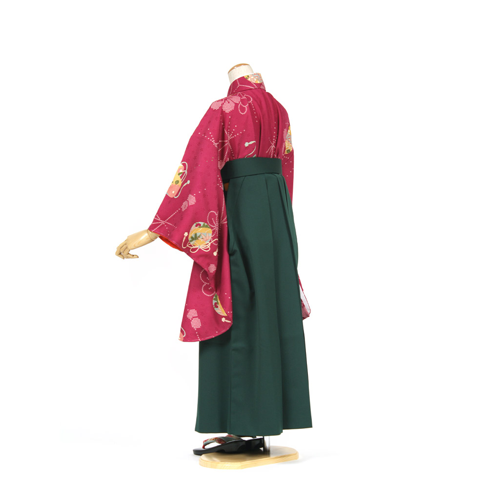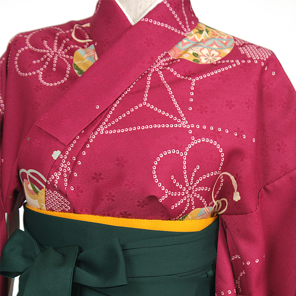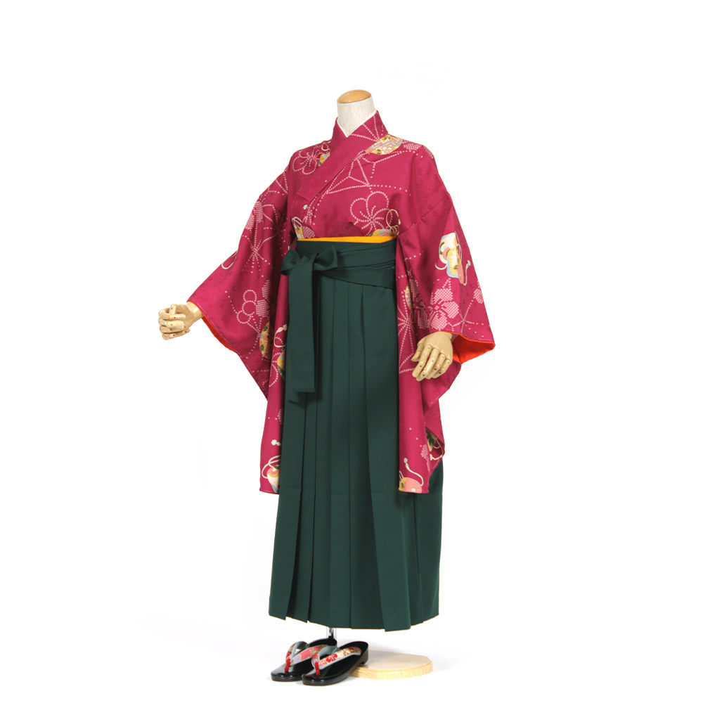 | セット内容 | 着物・袴・長襦袢・半幅帯・草履・巾着・足袋・着付け小物(前板・衿芯・伊達締・腰ひも) 特に何もご用意いただく必要はありませんが、着物用肌着の代わりに首元の開いた洋服用の下着・肌着をご用意ください。 *半巾帯は赤か黄となります。お選び頂けませんのでご了承下さい。 |