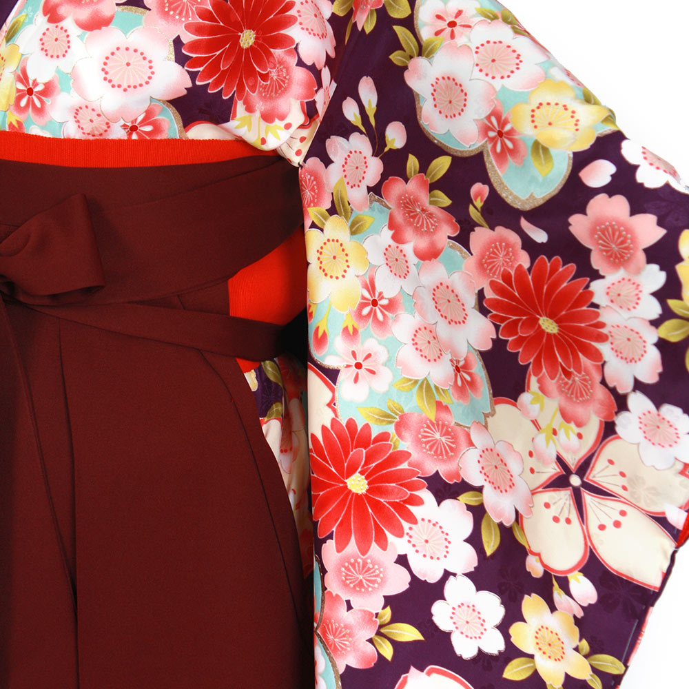 | セット内容 | 着物・袴・長襦袢・半幅帯・草履・巾着・足袋・着付け小物(前板・衿芯・伊達締・腰ひも) 特に何もご用意いただく必要はありませんが、着物用肌着の代わりに首元の開いた洋服用の下着・肌着をご用意ください。 *半巾帯は赤か黄となります。お選び頂けませんのでご了承下さい。 |