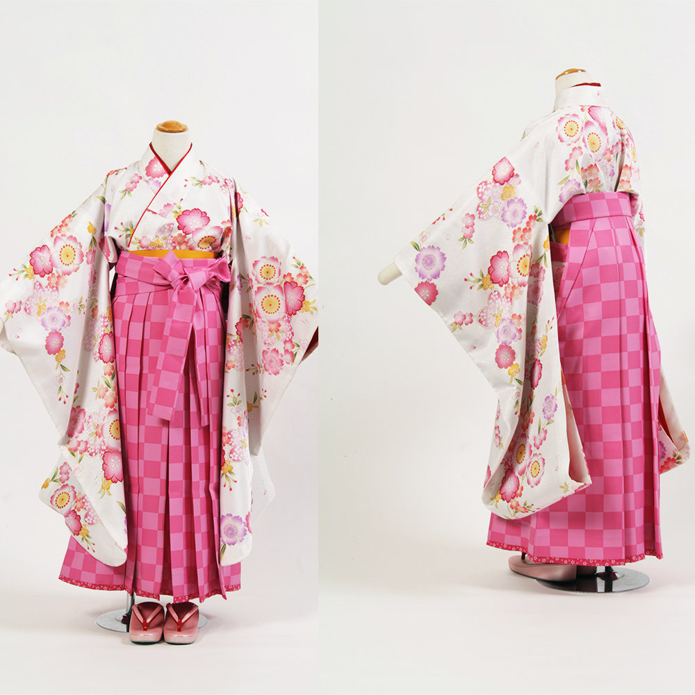 | セット内容 | (袴のタイプによって価格が変わります) 無地袴セット ¥15,000 + 消費税 柄・刺繍袴セット ¥17,000 + 消費税 着物・袴・長襦袢・袴下帯・草履・足袋・腰ひも 特に何もご用意いただく必要はありませんが、首元の開いた洋服用の下着をご用意ください。 サイズ調整は肩上げにて(サービス)対応します。 草履は予約状況やサイズにより写真のものとは異なる場合があります。 |